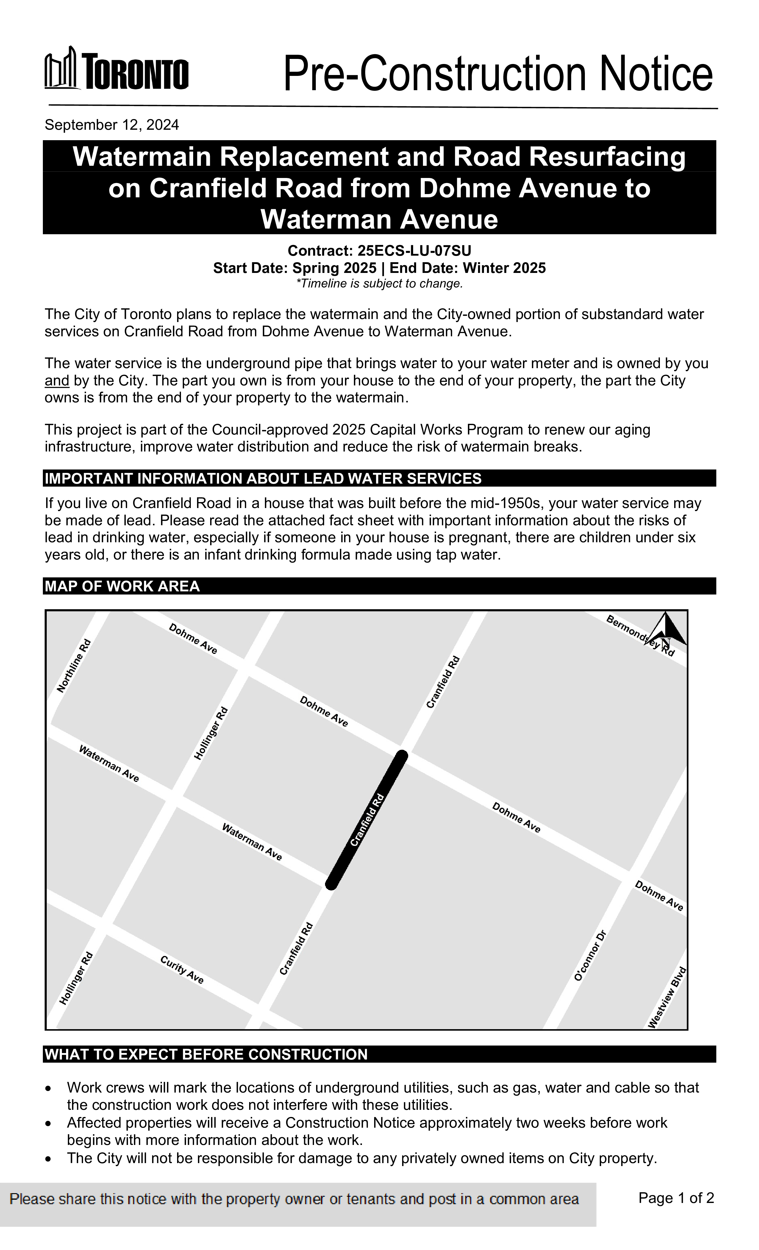 Engineering & Construction Services will be undertaking a watermain replacement project on Cranfield Road from Dohme Avenue to Waterman Avenue.