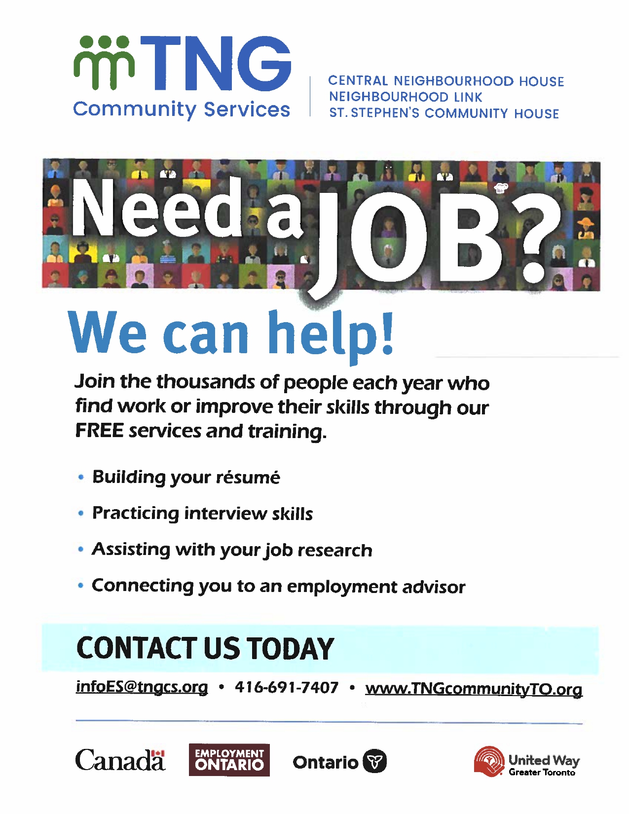 The Neighbourhood Group is offering FREE Employment Services to help you prepare for and find work. Whether you’re out of school and looking for a job, new to Canada and want your first Canadian work experience, looking to change your career, or trying to get back into the workforce, they have various training programs, work placements, workshops, online job board, and resource centres.