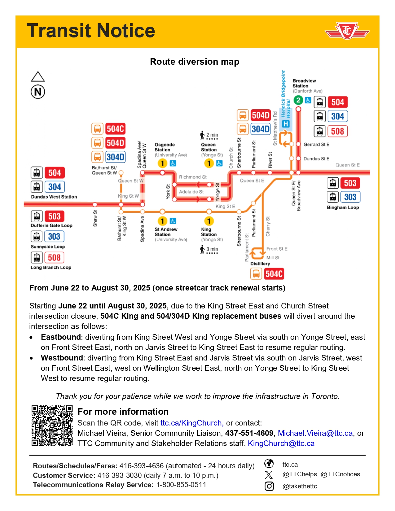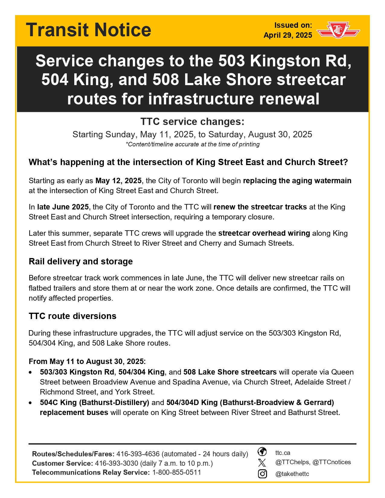 The TTC has developed an explainer video to help customers understand (and navigate) the upcoming service changes to the 503 Kingston Rd., 504 King and 508 Lake Shore King/Church construction-related diversions.